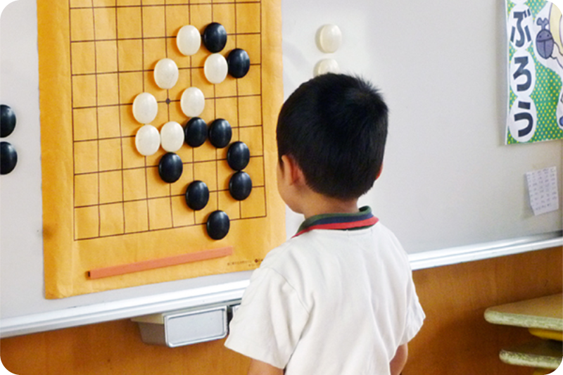 囲碁を打つ手や勝敗などを考えることで、集中力や、「自分で考える」という思考力も同時に育んでいきます。子ども一人ひとりに対して担当保育士が丁寧に指導をしています。(5歳児)