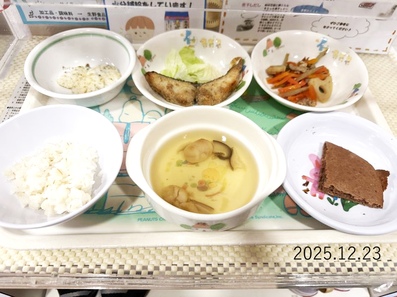給食 2025-12-23の給食 Posted on 2025-12-23 ■10時のおやつ せんべい ■おひるごはん 麦ごはん 清汁 鮭のごまみそ焼き レタス 豚肉と根菜のきんぴら ■3時のおやつ スキムココアケーキ クリックして X で共有 (新しいウィンドウで開きます) X Facebook で共有するにはクリックしてください (新しいウィンドウで開きます) Facebook クリックして Tumblr で共有 (新しいウィンドウで開きます) Tumblr クリックして Pinterest で共有 (新しいウィンドウで開きます) Pinterest