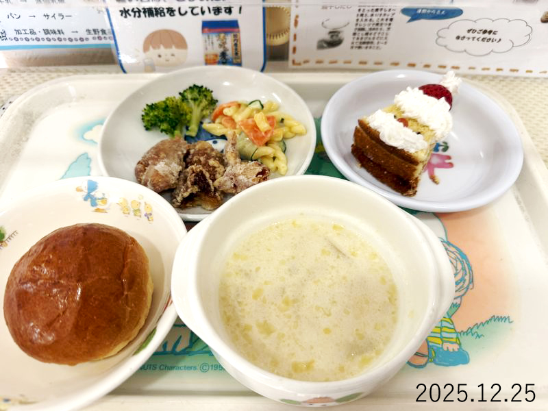 給食 2025-12-25の給食 Posted on 2025-12-25 ■10時のおやつ ■おひるごはん ロールパン 鶏のから揚げ ブロッコリー マカロニサラダ コーンスープ ■3時のおやつ ケーキ クリックして X で共有 (新しいウィンドウで開きます) X Facebook で共有するにはクリックしてください (新しいウィンドウで開きます) Facebook クリックして Tumblr で共有 (新しいウィンドウで開きます) Tumblr クリックして Pinterest で共有 (新しいウィンドウで開きます) Pinterest