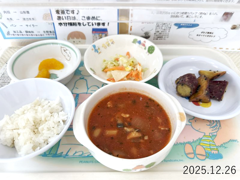 給食 2025-12-26の給食 Posted on 2025-12-26 ■10時のおやつ みかん缶 ■おひるごはん 麦ごはん 和風ブイヤベース コールスロー ■3時のおやつ 大学いも クリックして X で共有 (新しいウィンドウで開きます) X Facebook で共有するにはクリックしてください (新しいウィンドウで開きます) Facebook クリックして Tumblr で共有 (新しいウィンドウで開きます) Tumblr クリックして Pinterest で共有 (新しいウィンドウで開きます) Pinterest