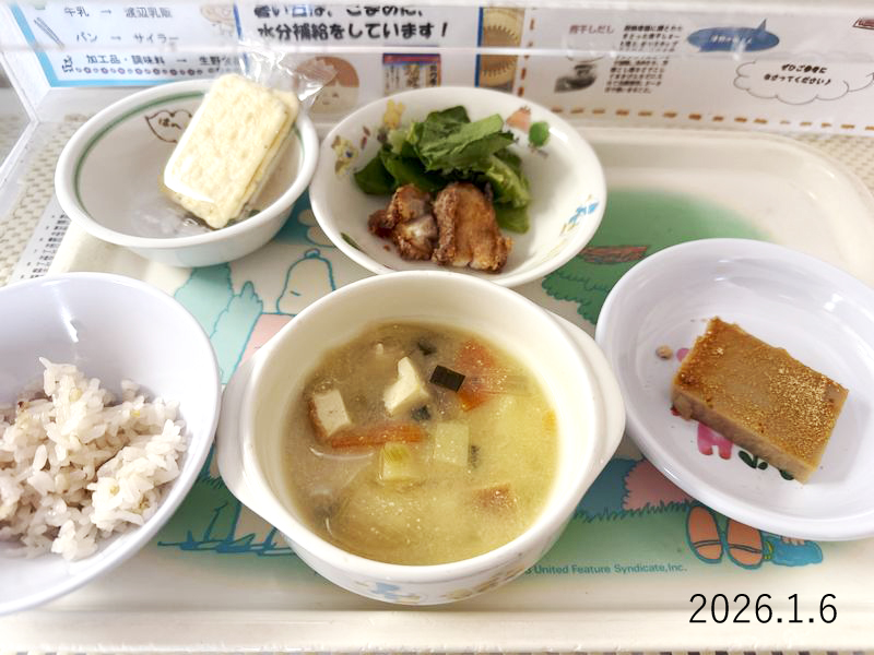 給食 2026-01-06の給食 Posted on 2026-01-06 ■10時のおやつ せんべい ■おひるごはん 十六穀米ごはん 鶏の竜田揚げ サラダ菜 じゃがいものみそ汁 ■3時のおやつ 黒糖豆乳ゼリー クリックして X で共有 (新しいウィンドウで開きます) X Facebook で共有するにはクリックしてください (新しいウィンドウで開きます) Facebook クリックして Tumblr で共有 (新しいウィンドウで開きます) Tumblr クリックして Pinterest で共有 (新しいウィンドウで開きます) Pinterest