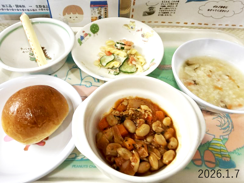 給食 2026-01-07の給食 Posted on 2026-01-07 ■10時のおやつ チーズ ■おひるごはん ロールパン ポークビーンズ マカロニとツナのサラダ ■3時のおやつ 七草粥 クリックして X で共有 (新しいウィンドウで開きます) X Facebook で共有するにはクリックしてください (新しいウィンドウで開きます) Facebook クリックして Tumblr で共有 (新しいウィンドウで開きます) Tumblr クリックして Pinterest で共有 (新しいウィンドウで開きます) Pinterest