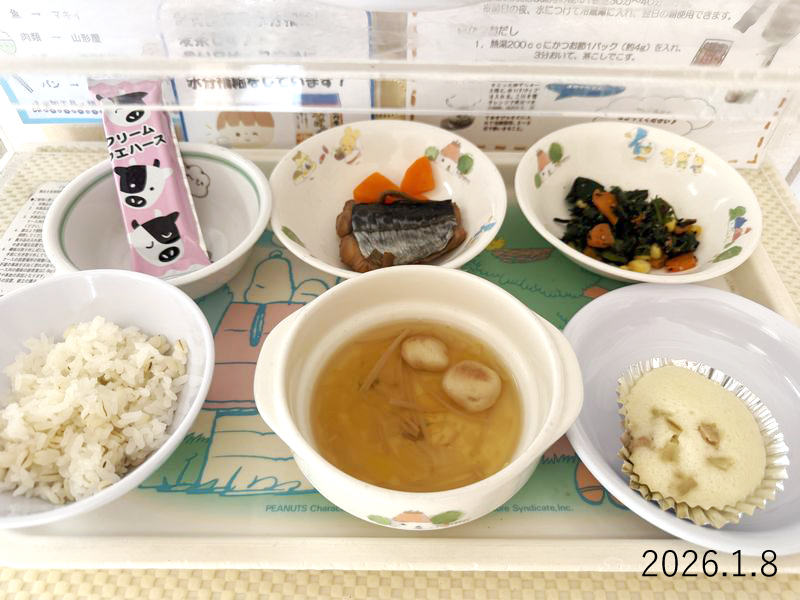 給食 2026-01-08の給食 Posted on 2026-01-08 ■10時のおやつ ウエハース ■おひるごはん 麦ごはん 清汁 煮魚 ほうれん草とひじきの和え物 ■3時のおやつ 肉万十 こんぶ クリックして X で共有 (新しいウィンドウで開きます) X Facebook で共有するにはクリックしてください (新しいウィンドウで開きます) Facebook クリックして Tumblr で共有 (新しいウィンドウで開きます) Tumblr クリックして Pinterest で共有 (新しいウィンドウで開きます) Pinterest