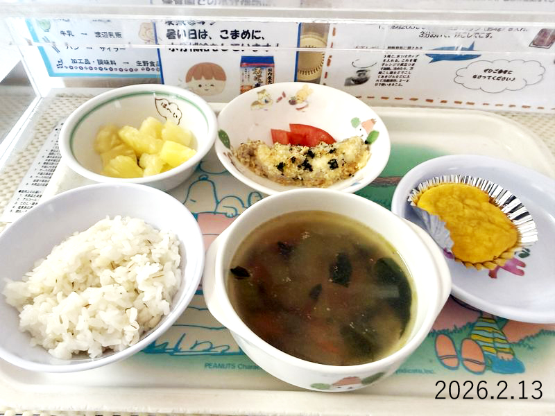 給食 2026-02-13の給食 Posted on 2026-02-13 ■10時のおやつ パイン缶 ■おひるごはん 麦ごはん 魚のパン粉焼き トマト チンゲンサイのスープ ■3時のおやつ ふわふわかぼちゃケーキ X で共有 (新しいウィンドウで開きます) X Facebook で共有 (新しいウィンドウで開きます) Facebook Tumblr で共有 (新しいウィンドウで開きます) Tumblr Pinterest で共有 (新しいウィンドウで開きます) Pinterest
