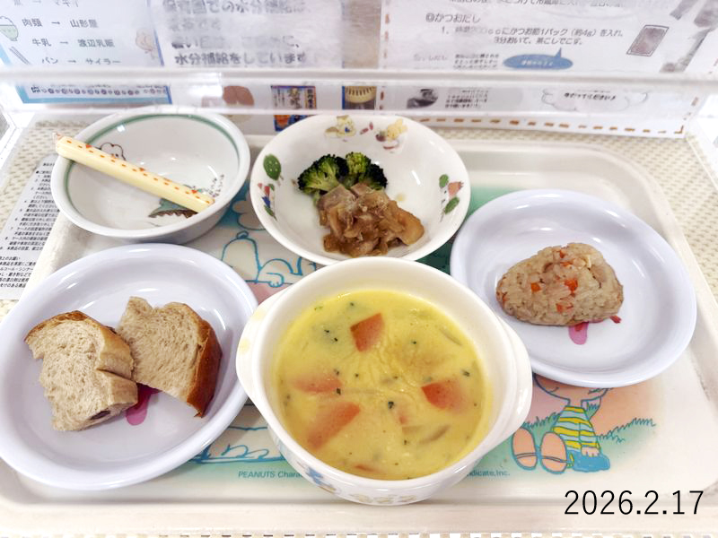 給食 2026-02-17の給食 Posted on 2026-02-17 ■10時のおやつ チーズ ■おひるごはん ぶどうパン 鶏のマリネ焼き ゆでブロッコリー かぼちゃスープ ■3時のおやつ 大豆ごはん(おにぎり) X で共有 (新しいウィンドウで開きます) X Facebook で共有 (新しいウィンドウで開きます) Facebook Tumblr で共有 (新しいウィンドウで開きます) Tumblr Pinterest で共有 (新しいウィンドウで開きます) Pinterest