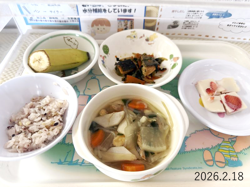 給食 2026-02-18の給食 Posted on 2026-02-18 ■10時のおやつ バナナ ■おひるごはん 十六穀米ごはん 鮭とほうれん草のオイスターソース炒め のっぺい汁 ■3時のおやつ いちご牛乳寒天 X で共有 (新しいウィンドウで開きます) X Facebook で共有 (新しいウィンドウで開きます) Facebook Tumblr で共有 (新しいウィンドウで開きます) Tumblr Pinterest で共有 (新しいウィンドウで開きます) Pinterest