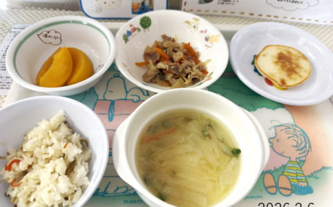 ■10時のおやつ パイン缶 ■おひるごはん 麦ごはん 魚のパン粉焼き トマト チンゲンサイのスープ ■3時のおやつ ふわふわかぼちゃケーキ
