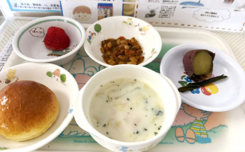 ■10時のおやつ いちご ■おひるごはん ロールパン チリコンカーン キャベツとコーンの豆乳スープ ■3時のおやつ 焼き芋 こんぶ