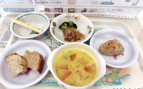 ■10時のおやつ チーズ ■おひるごはん ぶどうパン 鶏のマリネ焼き ゆでブロッコリー かぼちゃスープ ■3時のおやつ 大豆ごはん(おにぎり)