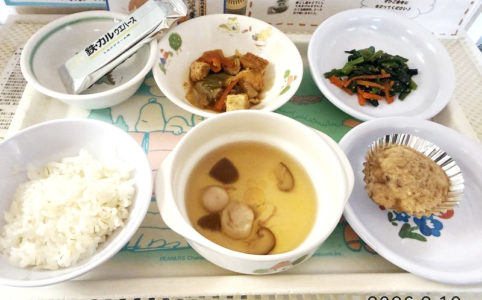 ■10時のおやつ ウエハース ■おひるごはん 麦ごはん 清汁 厚揚げとキャベツの回鍋肉 ほうれん草のごま和え ■3時のおやつ 小倉蒸しパン