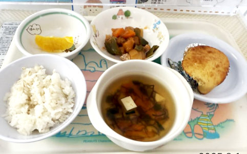 ■10時のおやつ パイン缶 ■おひるごはん 十六穀米ごはん 魚の竜田揚げ トマト かぼちゃの豆乳みそスープ ■3時のおやつ 米粉のにんじんおやき