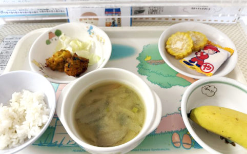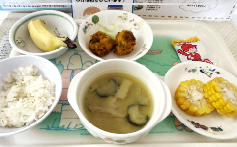 ■10時のおやつ バナナ ■おひるごはん 麦ごはん ツナとかぼちゃの落とし揚げ レタス 五目みそ汁 ■3時のおやつ とうもろこし クッキー