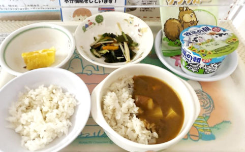 ■10時のおやつ オレンジ ■おひるごはん 麦ごはん カレー わかめのごま酢和え ■3時のおやつ ヨーグルト クラッカー