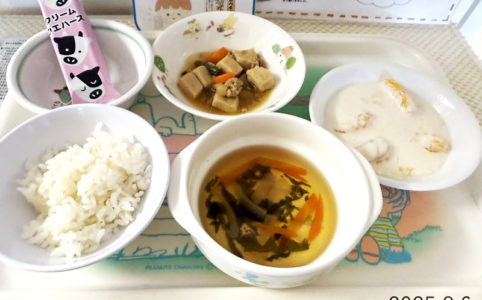 ■10時のおやつ ウエハース ■おひるごはん 麦ごはん 清汁 高野豆腐のそぼろ煮 切り干し大根のあちゃら漬け ■3時のおやつ フルーツヨーグルト