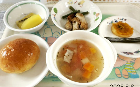 ■10時のおやつ パイン缶 ■おひるごはん 麦ごはん 夏野菜のポトフ 小松菜とコーンの炒め物 ■3時のおやつ ココア蒸しパン