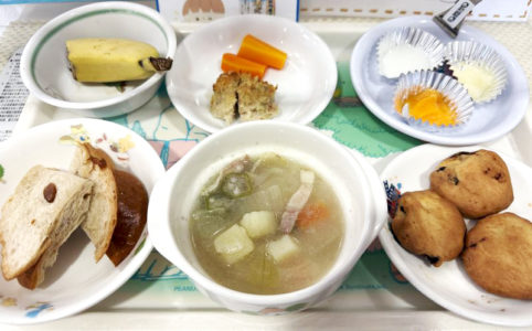 ■10時のおやつ バナナ ■おひるごはん ぶどうパン 魚のパン粉焼き にんじんの甘煮 ベーコンスープ ■3時のおやつ レーズンクッキー