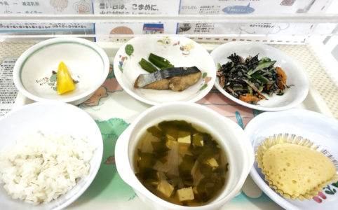 ■10時のおやつ オレンジ ■おひるごはん 麦ごはん 清汁 煮魚 ひじきの和風サラダ ■3時のおやつ チーズ蒸しパン