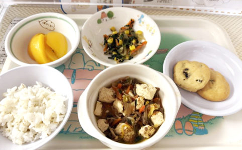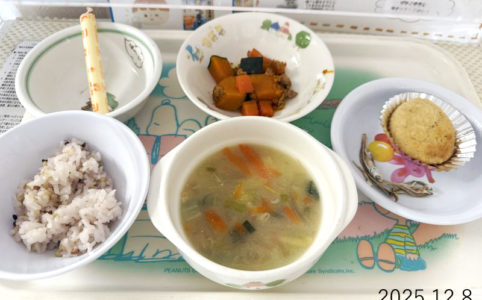 ■10時のおやつ チーズ ■おひるごはん 十六穀米ごはん かぼちゃのそぼろ煮 季節の具だくさんみそ汁 ■3時のおやつ おからマフィン いりこ