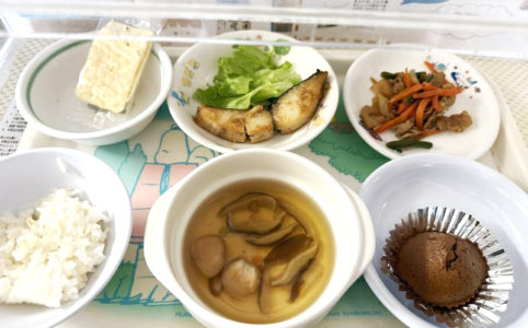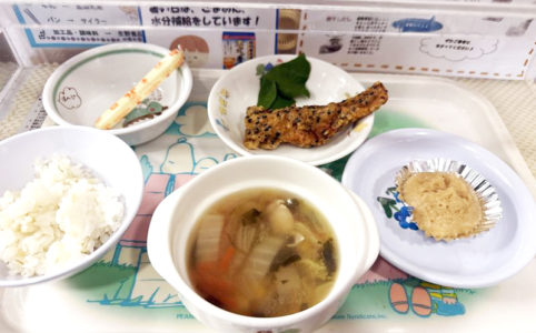■10時のおやつ せんべい ■おひるごはん 麦ごはん 清汁 魚のごまみそ焼き レタス 豚肉と根菜のきんぴら ■3時のおやつ スキムココアケーキ