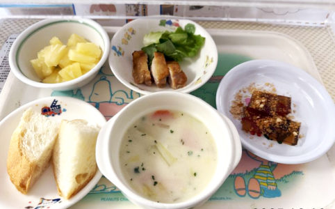 ■10時のおやつ パイン缶 ■おひるごはん 食パン ローストチキン サラダ菜 キャベツとコーンの豆乳スープ ■3時のおやつ 黒糖ゼリー