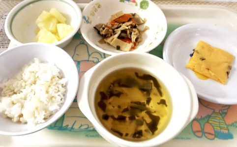 ■10時のおやつ パイン缶 ■おひるごはん 麦ごはん 清汁 豚肉のきのこ炒め 小松菜としらすのごま和え ■3時のおやつ 米粉のにんじんお焼き