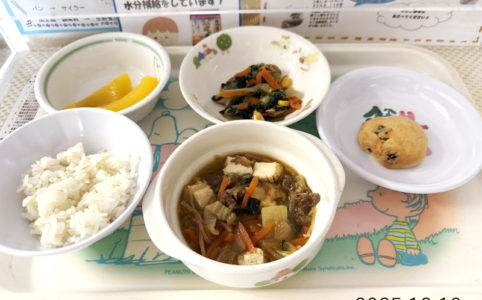 ■10時のおやつ もも缶 ■おひるごはん 麦ごはん すき焼き ほうれん草とツナの炒めもの ■3時のおやつ レーズンクッキー