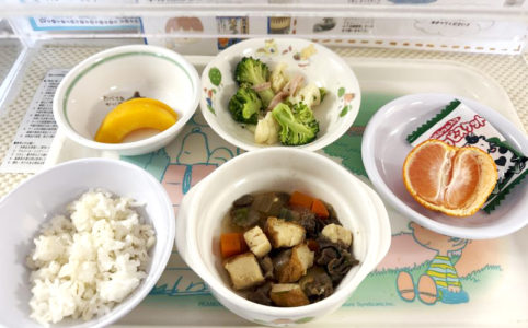 ■10時のおやつ もも缶 ■おひるごはん 麦ごはん 肉豆腐 カリフラワーとブロッコリーのサラダ ■3時のおやつ みかん クッキー