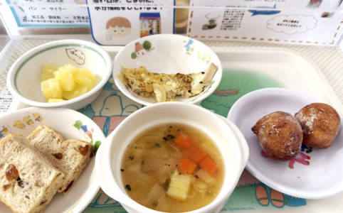 ■10時のおやつ パイン缶 ■おひるごはん ぶどうパン 魚のマヨネーズ焼き 野菜スープ ■3時のおやつ ドーナツ いりこ