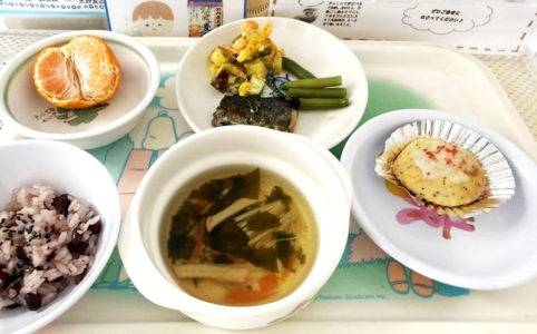 ■10時のおやつ みかん ■おひるごはん 赤飯 魚の香味焼き ゆでいんげん かぼちゃとさつまいものサラダ 清汁 ■3時のおやつ 紅茶マフィン