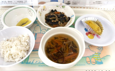 ■10時のおやつ せんべい ■おひるごはん 麦ごはん 魚のパン粉焼き にんじんの甘煮 豚汁 ■3時のおやつ ココアゼリー