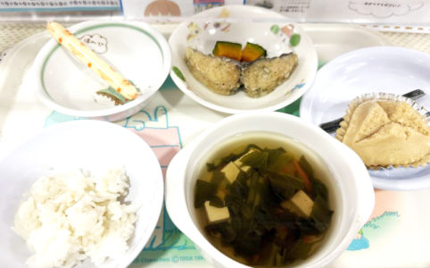 ■10時のおやつ チーズ ■おひるごはん 十六穀米ごはん 魚の磯辺揚げ 焼きかぼちゃ 小松菜と豆腐の清汁 ■3時のおやつ 黒糖蒸しパン こんぶ