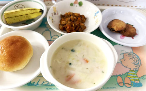 ■10時のおやつ パイン缶 ■おひるごはん 麦ごはん 煮魚 さつまいもとれんこんの豆乳みそ汁 ■3時のおやつ 米粉蒸しパン