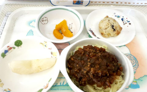 ■10時のおやつ みかん缶 ■おひるごはん ジャージャー麺 梨 ■3時のおやつ シリアルスコーン