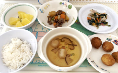 ■10時のおやつ パイン缶 ■おひるごはん 麦ごはん 清汁 肉じゃが ほうれん草の中華和え ■3時のおやつ さつまいもボール