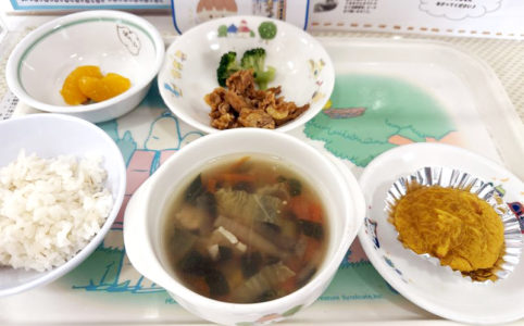 ■10時のおやつ みかん缶 ■おひるごはん 麦ごはん ポークチャップ ゆでブロッコリー チンゲンサイのスープ ■3時のおやつ かぼちゃと豆腐の米粉のケーキ