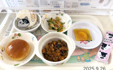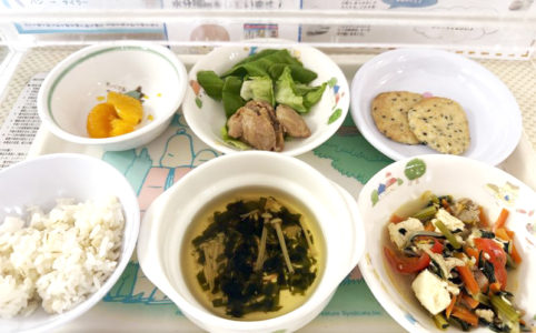 ■10時のおやつ みかん缶 ■おひるごはん 麦ごはん 鶏肉のさっぱり煮 サラダ菜 チャンプル ■3時のおやつ 黒ごまとチーズのクッキー