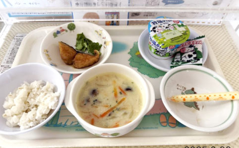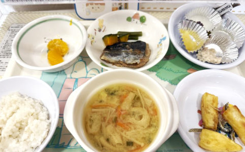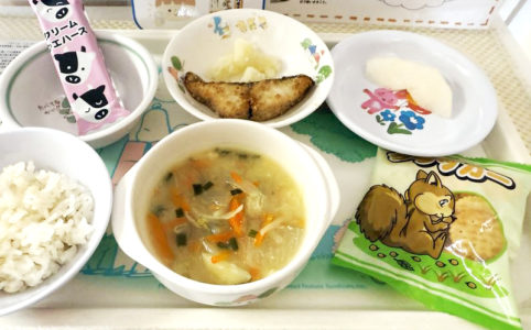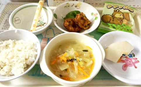 ■10時のおやつ チーズ ■おひるごはん 麦ごはん 魚の揚げ煮 サラダ菜 きのこと豆乳のコーンスープ ■3時のおやつ ヨーグルト ビスケット