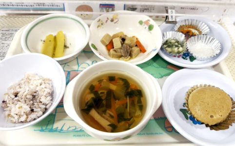 ■10時のおやつ キウイ ■おひるごはん 十六穀米ごはん 高野豆腐と野菜の含め煮 清汁 ■3時のおやつ マーラーカオ いりこ