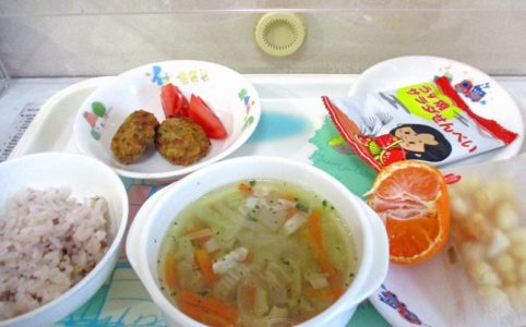 ■10時のおやつ せんべい ■おひるごはん 十六穀米ごはん 納豆の天ぷら トマト 野菜スープ ■3時のおやつ みかん あられ