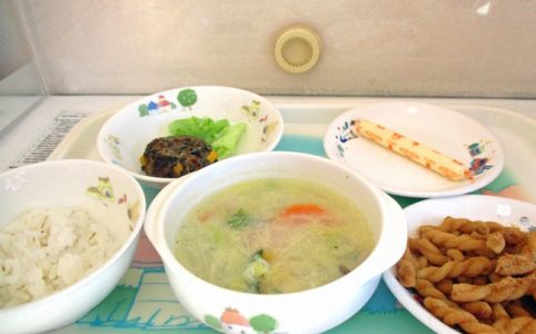 ■10時のおやつ チーズ ■おひるごはん 麦ごはん ひじきとコーンのハンバーグ レタス かぼちゃの豆乳みそスープ ■3時のおやつ マカロニのきな粉和え