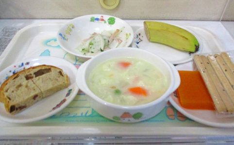 ■10時のおやつ バナナ ■おひるごはん ぶどうパン カリフラワーのシチュー かぶのサラダ ■3時のおやつ にんじんゼリー ビスケット