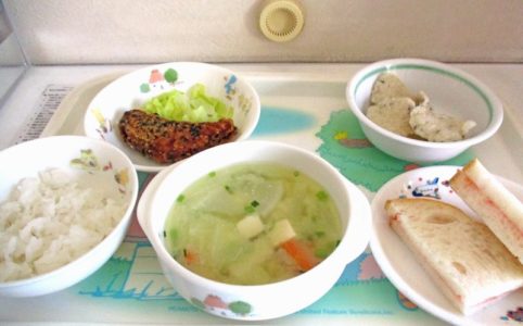 ■10時のおやつ せんべい ■おひるごはん 麦ごはん 鮭のごま揚げ レタス さといものみそ汁 ■3時のおやつ ジャムサンドパン いりこ