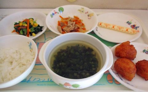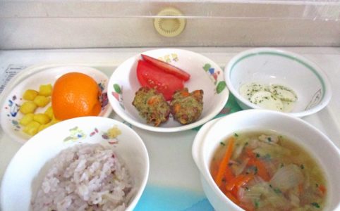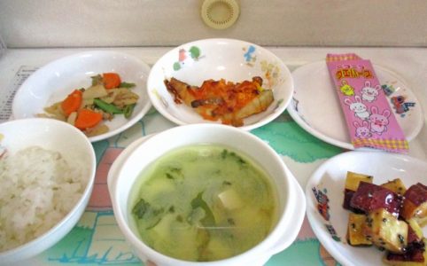 ■10時のおやつ せんべい ■おひるごはん 十六穀米ごはん 納豆の天ぷら トマト 野菜スープ ■3時のおやつ みかん あられ
