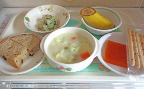 ■10時のおやつ バナナ ■おひるごはん ぶどうパン カリフラワーのシチュー かぶのサラダ ■3時のおやつ にんじんゼリー ビスケット