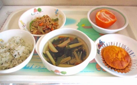 ■10時のおやつ みかん ■おひるごはん ごまごはん 厚揚げとキャベツの回鍋肉 清汁 ■3時のおやつ ふわふわかぼちゃケーキ