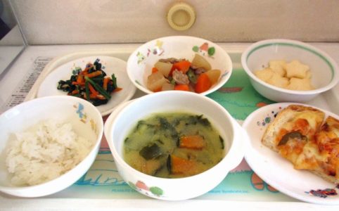 ■10時のおやつ せんべい ■おひるごはん 麦ごはん みそ汁 豚肉と大根の煮物 ほうれん草とツナの和え物 ■3時のおやつ ピザトースト