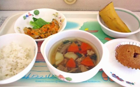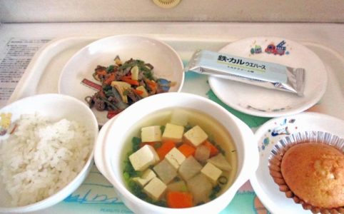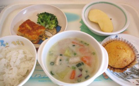 ■10時のおやつ りんご ■おひるごはん 麦ごはん 千草焼き ゆでブロッコリー さつまいもとれんこんの豆乳みそ汁 ■3時のおやつ にんじんカップケーキ いりこ