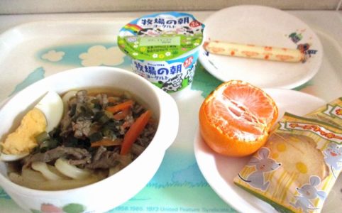 ■10時のおやつ チーズ ■おひるごはん 肉うどん ゆで卵 ヨーグルト ■3時のおやつ みかん クッキー