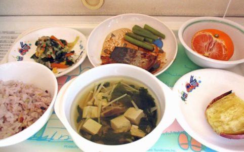 ■10時のおやつ みかん ■おひるごはん 十六穀米ごはん 清汁 魚のみそ煮 キャベツとわかめの和え物 ■3時のおやつ 焼きいも