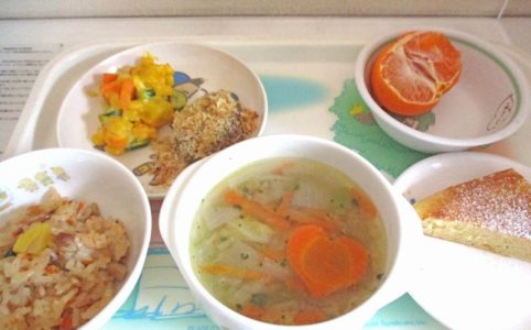 ■10時のおやつ みかん ■おひるごはん 中華風おこわ 焼きメンチカツ かぼちゃとさつまいものサラダ 野菜スープ ■3時のおやつ チーズケーキ